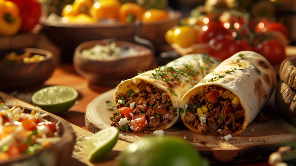 Große Weizentortillas, reichhaltig gefüllt mit Reis, Bohnen, Mais, Gemüse und wahlweise Hähnchen oder Rindfleisch. Überbacken und serviert mit frischen Beilagen.
